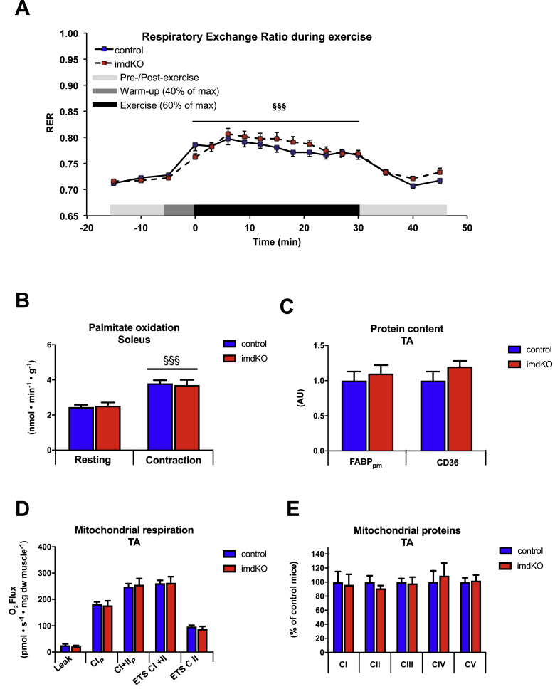 Substrate utilization in control and AMPKα imdKO mice during treadmill exercise was investigated at the same relative intensity (60% of individual maximal running speed). RER before exercise was comparable in the 2 genotypes (∼0.72) and increased similarly during 30 min of treadmill exercise (averaged 0.78 ± 0.01 and 0.79 ± 0.01 for control and AMPKα imdKO mice, respectively; Figure 6A). Upon cessation of exercise, RER declined to pre-exercise levels with no difference between genotypes. These findings suggest that exercise at the same relative intensity exerts a similar metabolic response in control and AMPKα imdKO mice. In accordance, the measurement of exogenous palmitate oxidation in isolated soleus muscles revealed that FA oxidation was similar between genotypes at rest and increased to the same extent in response to electrically stimulated muscle contractions (Figure 6B). Impaired FA oxidation in mice with chronic deletion of AMPK activity in skeletal muscle (AMPKα mdKO) has been associated with reduced expression of FA handling transport proteins (CD36 and FABPpm) [16,40]. However, the protein content of these FA transporters was similar in control and AMPKα imdKO mice (Figure 6C and Suppl. Fig. S3H).