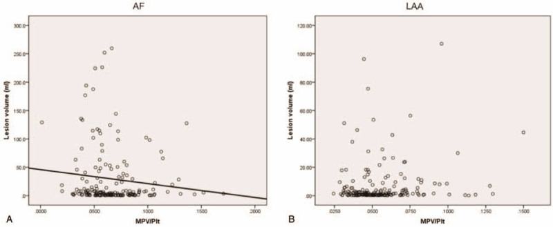 The association of MPV/Plt (A) with lesion volume in AF and LAA (B). AF = atrial fibrillation, LAA = large artery atherosclerosis, MPV/Plt = mean platelet volume/platelet count.