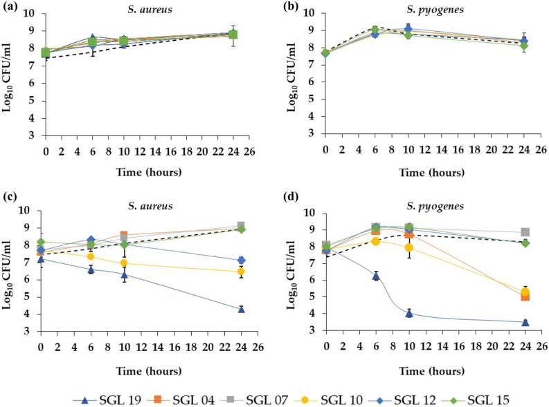 Inhibition of S. aureus and S. pyogenes growth by LAB. Antimicrobial activity of 90 µg LAB lysates on 107 CFU/ml (a) S. aureus and (b) S. pyogenes, and of 108 CFU/ml live LAB on 107 CFU/ml (c) S. aureus and (d) S. pyogenes growth in a competition assay. Results are expressed as the mean ± SEM. (dashed lines) pathogen; (filled rectangle) L. paracasei SGL 04; (open rectangle) L. plantarum SGL 07; (open circle) L. fermentum SGL 10; (fiiled diamond) L. brevis SGL 12; (open diamond) L. casei SGL 15; (filled triangle) L. salivarius SGL 19.