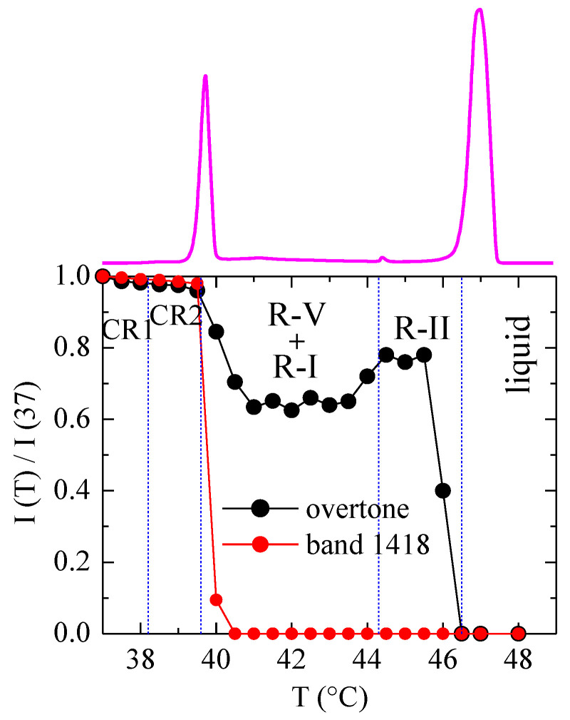 The next step addresses the analysis as function of temperature (and, implicitly, with the phase present) of some parameters related to these Raman spectra. Thus, Figure 9 shows such variation for the ratio of the intensity at temperature T to that at 37 °C for the first overtone and for the band at 1418 cm−1. Since these Raman experiments (see Experimental) have been acquired in a step-temperature mode (with an average heating rate smaller than 0.2 °C/min), the DSC heating curve shown at the top of Figure 9 corresponds to a heating rate of 0.2 °C/min (see Figure 2).