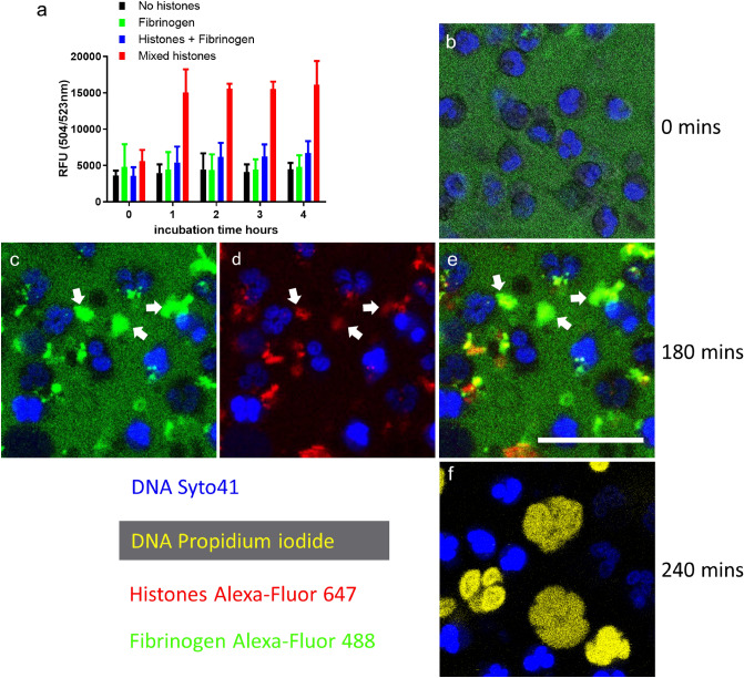 Fibrinogen protects neutrophils from histone cytotoxicity. (a) Sytox Green neutrophil viability assays. Neutrophils were seeded in 96 well plates and allowed to adhere before media was removed and replaced with media containing histones and/or fibrinogen and Sytox Green. Fluorescence was measured every hour. Cells were stable in media and with added fibrinogen, error bars show 95% CI for the mean, n = 3. Cells were efficiently killed with 60 µg/ml of mixed histones within an hour but were rescued by the presence of 0.5 mg/ml fibrinogen. Panels (b–e) are stills from live cell videos of neutrophils to explore the mechanism of fibrinogen protection. Neutrophils were plated onto a glass-bottom dish in media containing Syto41 and propidium iodide before sequential addition of fibrinogen and histones. (b) Neutrophils against a green background of labelled 2.5 mg/ml fibrinogen (spiked with Alexa 488-fibrinogen) with no histones added at time zero. (c–e) Cells after 180 min of incubation with Alexa-Fluor 647 labelled histones (20 μg/ml) in media containing Alexa-Fluor 488 labelled fibrinogen and showing Syto41 blue stained nuclei. Images shown are (c) green/blue channels, (d) red/blue channels and (e) merged image. Rapid aggregate formation between histones and fibrinogen was apparent, which persisted (e.g. arrows). There were many intact cells, retaining the lobular nuclear structure of healthy neutrophils, stained in blue with Syto41, even after 180 or 240 min of incubation under these conditions. (f) An image taken after 240 min showing some large externalised NET-like DNA structures stained yellow with propidium iodide. The scale bar is 25 µm. Representative images are shown from 1 of n = 2 independent experiments.