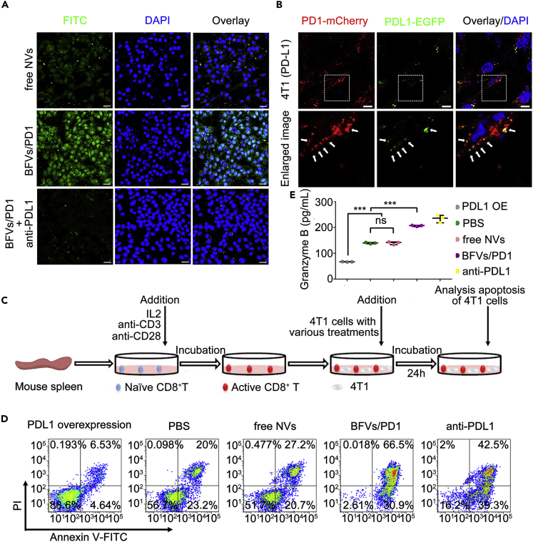 (C) Representative procedure to schematically show the experimental design of the CTL cytotoxicity assay in vitro. Naive CD8+ T cells extracted from mouse spleen were activated by incubation with IL2, anti-CD3, and anti-CD28 antibodies, then they were added into 4T1 cells that previously underwent various treatments indicated as below: 4T1 cells over-expressing PDL1 (PDL1 OE), or normal 4T1 cells treated with PBS (PBS), free NVs, BFVs/PD1, or PDL1 antibody (anti-PDL1). After 24 h of co-incubation, the apoptosis ratio of 4T1 cells was measured.