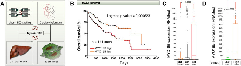 MYO18B mRNA expression in integrated cluster iC3 and C19MC miRNA expressing tumors reflects poor prognosis in hepatocellular carcinoma. (A) Schematic showing the known involvement of MYO18B in various pathophysiological conditions. (B) TCGA-HCC survival data showing the association of high MYO18B mRNA expression to poor prognosis of patients. The upper and lower percentages used to extract survival data from Oncolnc database was 40%. (C) TCGA RNA-seq data showing the higher expression of MYO18B mRNA in iCluster-3 (iC3) compared to iClusters-1 and 2. The data is represented as 10–90% box and whisker plot with whiskers of 75% transparency. (D) Integrated iCluster RNA-seq dataset to miRNA-seq dataset showing the increased expression of MYO18B in C19MC miRNA expressing HCCs. Note: The C19MC high versus low grouping was based on cumulative expression of all 46 C19MC miRNAs. The data is represented as 10–90% box and whisker plot with whiskers of 75% transparency.