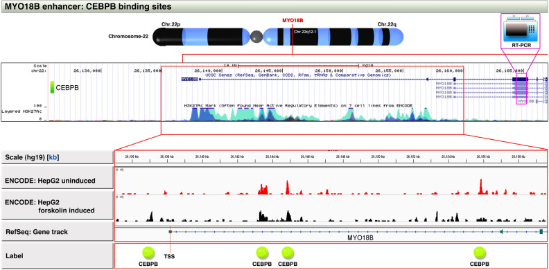 MYO18B enhancer region CEBPB binding sites and selection of exons for RT-PCR analysis. The MYO18B gene location is shown in the chromosome locus “22q12.1” by a red vertical line. The enhancer region of MYO18B gene with H3K27Ac mark (Chr22: 26,135,000–26,160,000 [hg19]) in UCSC Genome Browser track (blue peaks) was focused to show CEBPB binding at this region using ENCODE CEBPB ChIP-seq HepG2 data (red and black peaks). Note the three CEBPB binding sites (indicated by red peaks) within the enhancer region (indicated by red box) in uninduced HepG2 cells and a notable fourth binding site close to transcription start site (TSS) in forskolin induced HepG2 cells. One another CEBPB site was far upstream to enhancer region (indicated by green shaded box). The exon chosen for RT-PCR analysis is indicated at exon-3 of long isoform.