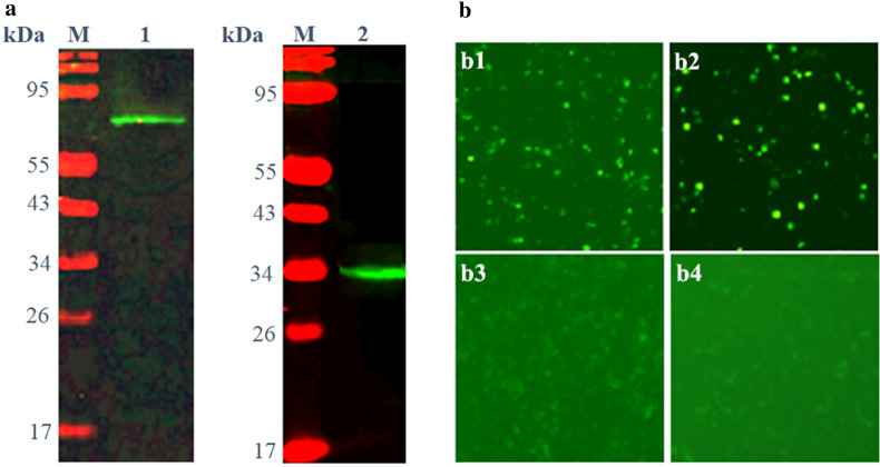 Interaction between EtAMA1 and EtEsp in DF-1 cells assessed with BiFC. a DF-1 cells were transfected with VC155-EtAMA1 and VN155-EtEsp and the cellular lysates were analyzed with immunoblotting using antisera against EtAMA1 and EtEsp. Lane 1: anti-r EtAMA1 antibody; Lane 2, anti-r EtEsp antibody. b BiFC was performed. b1 DF-1 cells were co-transfected with VC155-EtAMA1 and VN155-EtEsp. b2 DF-1 cells were co-transfected with positive controls bFos and bJun. b3 DF-1 cells were co-transfected with pBiFC-VC155-EtAMA1 and pBiFC-VN155 empty vector. b4 DF-1 cells were co-transfected with pBiFC-VN155-EtEsp and pBiFC-VC155 empty vector