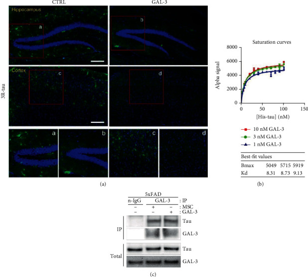 GAL-3 alleviates the formation of aberrant tau through protein binding in 5xFAD mice. (a) Each tissue section was stained with DAPI and anti-3R-tau antibodies. The tile scan images using a confocal microscope are shown in green (aberrant tau) in the hippocampal or cortical region (scale bars = 200 μm). The boxed areas represent magnified images. (b) Saturation curves were determined by fluorescence intensities of the interaction between tau-K18-His fragment and GAL-3 in AlphaLISA format by the FRET-based assay. Tau-K18-His fragment and GAL-3 proteins were incubated together at a wide range of concentrations (Tau-K18-His fragment: 0 ~ 100 nM, GAL-3: 1 ~ 10 nM) followed by analysis with specific Alpha Donor/Acceptor beads. (c) hUCB-MSC- or GAL-3-injected 5xFAD mouse brains were extracted, and anti-GAL-3 immunoprecipitates and total lysates were analyzed by western blotting with anti-Tau or anti-GAL-3 antibodies. The n-IgG used as a control was immunoprecipitated by normal IgG antibody. CTRL: PBS-administrated 5xFAD; GAL-3: GAL-3-injected 5xFAD; MSC: hUCB-MSC-administrated 5xFAD.