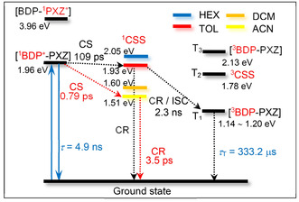 Charge recombination (CR)‐induced ISC was known for electron donor/acceptor dyads with a long and rigid linker between donor and acceptor.8 A large distance, thus a weak electronic coupling and a small electron exchange energy (J), is indispensable for the radical pair ISC (RP ISC) mechanism in these conventional electron donor/acceptor dyads. This type of ISC is based on the hyperfine interaction enhanced 1CT→3CT process (CT: charge transfer), followed by 3CT→locally excited triplet state (3LE) internal conversion (given the purpose is to access the 3LE, not the long‐lived CT state). However, these conventional electron donor/acceptor dyads are difficult to prepare, and generally the molecular structures are not optimized for triplet PS preparation, and the visible light‐harvesting ability is poor. When the linker between the electron donor and acceptor was reduced in length, for instance by a direct link between donor and acceptor in compact dyads, the electronic coupling and the electron exchange energy increase, and RP ISC is inhibited.9
