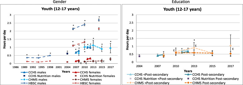 Self-reported daily average leisure screen time by gender and household education level within each age group. Error bars represent 95% confidence intervals around the mean. Stars (*) indicate differences at p < 0.05. E – Interpret estimate with caution due to high sampling variability. CCHS Annual – Core content (2007–2008, 2011–2012); CCHS– Nutrition Focus (2004); and CHMS (2007–2009, 2009–2011, 2012–2013, 2014–2015, 2016–2017); HBSC (1990, 1994, 1998, 2002, 2006, 2010, 2014)