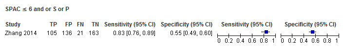Two review authors independently performed data extraction and quality assessment using QUADAS2 for each study. For each test, 2 x 2 tables were constructed and sensitivity and specificity were calculated. When four or more studies provided data at fixed thresholds for each test, we fitted a bivariate model using the METANDI function in STATA to calculate pooled point estimates for sensitivity and specificity. For comparisons between index tests and subgroups, we performed a likelihood ratio test comparing the model with and without the covariate.