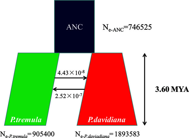 A coalescent simulation-based method was employed to infer demographic histories of P. davidiana and P. tremula. Eighteen different models were formulated to simulate the past population histories of P. davidiana and P. tremula that differed in terms of: (A) AsymmetricMigration without population expansion; (B) NoMigration without population expansion; (C) AsymmetricMigration with population expansion; (D) complex model, including a bottleneck in N; (E) complex model, including a bottleneck in S (Figure S3, Table 1). The most appropriate model was one of complex isolation-with-migration, after the two species diverged, P. davidiana experienced exponential growth, whereas a stepwise population size change occurred in P. tremula (Figure 4). A detailed effective population size, differentiation time point and gene flow of P. davidiana and P. tremula is displayed in Table 2, which also presents the 95% confidence interval (CIs) for the related parameters. The ancestors of the two aspen diverged into P. davidiana and P. tremula populations approximately 3.60 million years ago (Mya) (bootstrap range [BR]: 3.58–3.65 Mya). The current effective population sizes (Ne) of P. tremula (Ne-P. tremula) and P. davidiana (Ne-P. davidiana) are 905,400 (BR: 891,235-912,578) and 1,893,583 (BR:1,883,565–1,902,325), respectively. The effective population sizes of the two species are all significantly higher than their common ancestor (Ne-ANC = 746,525 [721,632–756,985]). The migration rate (m) is also clear among the two species, the lowest generation migration rate (m) between P. davidiana and P. tremula (4.43 × 10−8 and 2.52 × 10−7), not an accident due to the large geographical distance between the two populations.