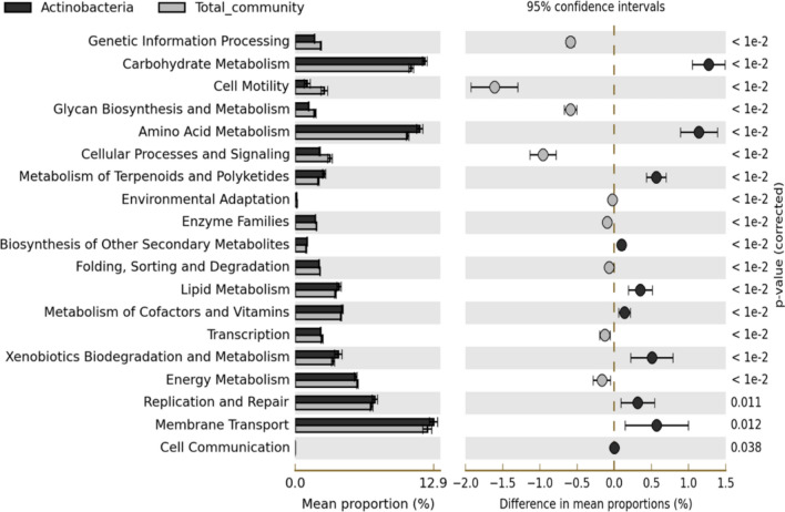 Extended error bar plot showing the predicted KO-level 2 categories significantly different between total community and Actinobacteria members from Deschampsia antarctica Desv. rhizosphere (n = 9). Only P < 0.05 is displayed. (Kanehisa; Goto, 2000; Kanehisa et al., 2019; Kanehisa, 2019; Langille et al., 2013)38–41.