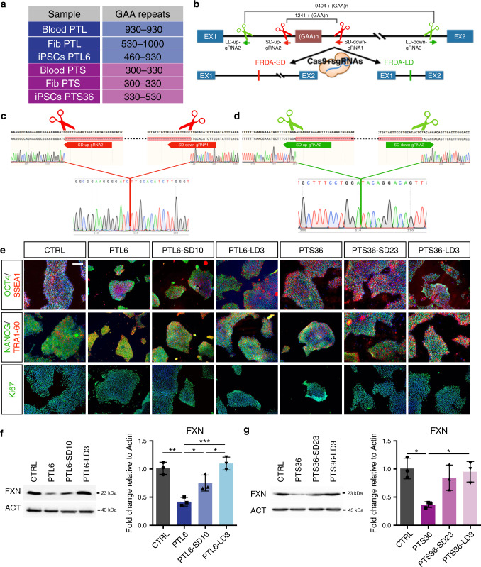 a Annotation of GAA repeats in different cell lines from FRDA patients PTS and PTL. b Illustration of CRISPR-based deletions in FXN intron 1. Pairs of sgRNAs drive Cas9-based targeted excision to proximal sites (red) flanking the GAA tract and long distal sites (green). Thus, short (SD) or long deletions (LD) of the FXN intron 1 are generated in FRDA-SD and FRDA-LD iPSC lines, respectively. c, d Representative Sanger sequencing confirming the generation of the short (c) and long deletion (d) in FRDA patient iPSCs. e Immunocytochemistry of the crucial pluripotency markers OCT4, NANOG, SSEA1 and TRA-1-60 on CTRL and untreated or targeted patient iPSCs. Scale bar, 100 μm. f, g Quantitative analysis of frataxin protein levels in PTL6 (f) and PTS36 (g) and their relative targeted iPSC lines. Protein levels are normalized to Actin. Mean ± s.d., n = 3 independent experiments, 24–36 organoids/line/experiment. *P < 0.05; **P < 0.01; ***P < 0.001; one-way ANOVA with Bonferroni correction.
