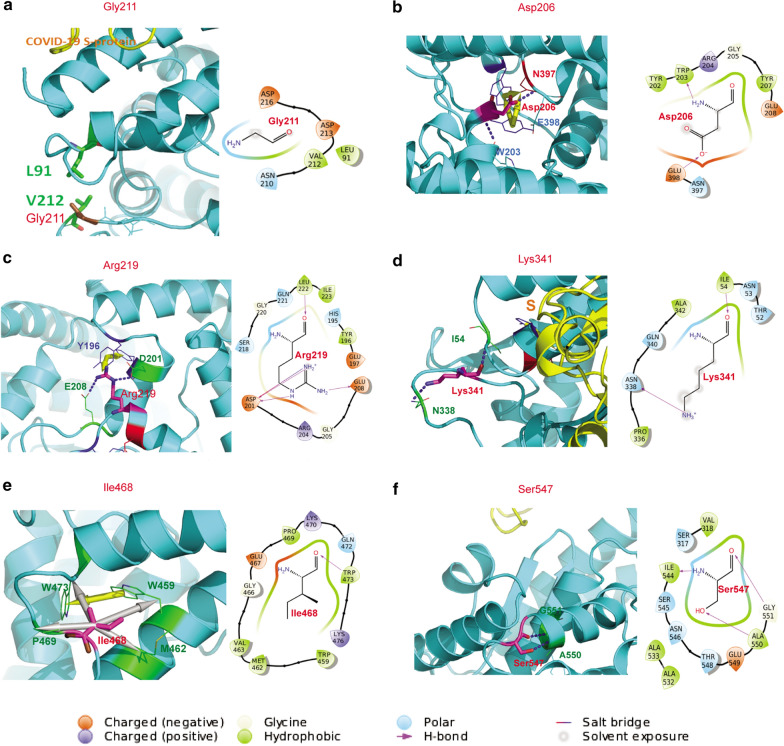 Interaction diagrams for the six residuals from seven ACE2 missense variants. a Interactions of Gly211Arg, b interactions of Asp206Gly, c interactions of Arg219Cys/His, d interactions of Lys341Arg, e interactions of Ile468Val and f interactions of Ser547Cys. Hydrogen bonds are depicted as blue dots. Π-interactions are depicted as yellow arrows. Hydrophobic interactions are shown as grey arrows. Water molecules from water-bridge are displayed as red spheres