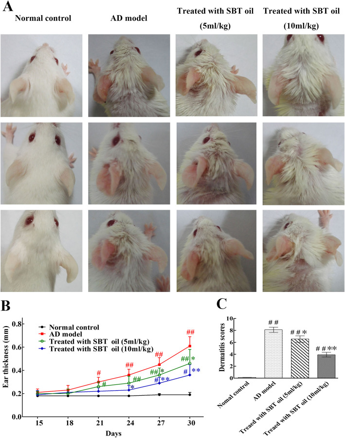 Topical application of DNCB followed schedule including sensitization and challenge induced AD-like skin lesions, presenting as erythema, itching and hemorrhage companied by abnormal scratching marks and dryness. The ear thickness and dermatitis scores were all significantly increased in AD model group compared to control group. After SBT Oil administration for 15 days, the ear thickness and dermatitis scores in groups treated with SBT oil were significantly decreased in a dose-dependent manner compared to the AD model group which indicate that SBT oil administration suppressed the development of AD-like skin lesions.