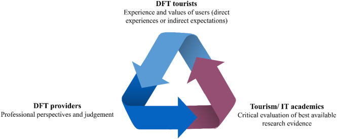 Secondly, the other two groups of informants, including DFT providers and IT/tourism academics were also consulted. Providers and academics were requested to express their views of the relationship between DFT and tourists' traits based on their observation of situations that they witnessed and their knowledge of tourist behaviours. Specifically, the perspectives of three groups of informants were examined and compared. Common components in the discourses of the three groups were brought together. As a result, a golden evidence triangle was formed to confirm the link between characters strengths and DFT that were suggested by tourists.