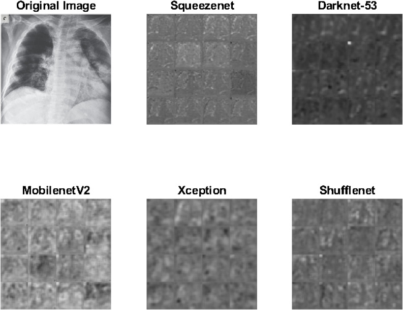 Sample activations using last convolutional layer of Squeezenet, Darknet-53, MobilenetV2, Xception and Shufflenet is shown in Fig. 2 .