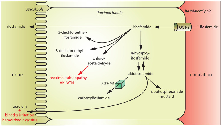 Mechanism of ifosfamide-associated tubular toxicity. Ifosfamide is transported in the proximal tubular cells through organic cation transporter-2. Ifosfamide undergoes substantial metabolization with the production of acrolein (responsible for bladder irritation and haemorrhagic cystitis) and chloro-acetaldehyde (responsible for the development of proximal tubulopathy). ALDH1A1: aldehyde dehydrogenase 1A1.