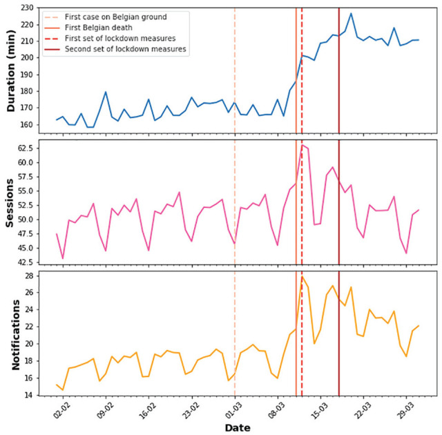 During the COVID-19 crisis, momentary increases in browser and dedicated news app use when important messages are communicated may reflect such real-time information consumption. For example, on March 12, there were rumors that the Belgian national security council would announce severe lockdown restrictions, including the closure of bars, restaurants, and schools. People anticipated that a press conference would take place in the early evening. Eventually, however, the press conference announcing the first set of “lockdown lite” measures took place around 10:30 p.m. We are able to zoom in on smartphone news use during this key event of the outbreak. To understand how smartphones have been used during the COVID-19 crisis to help people to be informed and get informed, we ask the following research questions: