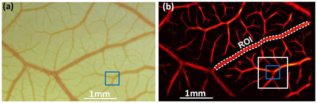 Figure 3 shows a systematic comparison between the SR-UMI image obtained using the proposed methods and the ground truth microscopic image from the same region of the CAM surface microvessel. The similarity was quantitatively evaluated by the normalized cross-correlation coefficients (CCC) between the two images. The microscopic image (Fig. 3(a)) was first resized to the size of the SR-UMI image (Fig. 3(b)) and converted to grayscale using MATLAB functions imresize.m and rgb2gray.m. To register the microscopic and the SR-UMI images, a target patch (blue box, Fig. 3(a)) selected from the microscopic image was traversed through the entire corresponding search window (white box, Fig. 3(b)) of the SR-UMI image to locate a maximum CCC, which was then recorded. The targeted patch then traverses the entire microscopic image with a step size of one pixel to produce a CCC map. The mean value of the CCC map was then used to assess the overall similarity of the SR-UMI image to the microscopic image.