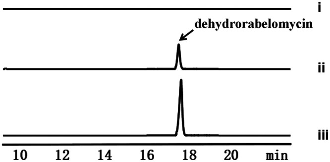 The influence of AlpS in the E. coli dehydrorabelomycin production. (i) E. coli BAP1/pGro7/pXY-2/pXY-3/pXY-6 without IPTG inducing (control); (ii) E. coli BAP1/pGro7/pXY-2/pXY-3/pXY-6; (iii) E. coli BAP1/pGro7/pKM-1/pXY-3/pXY-6 (the crude extract was diluted 10 times before HPLC analysis). pKM-1contains one copy of alpS. HPLC traces were recorded at 424 nm.