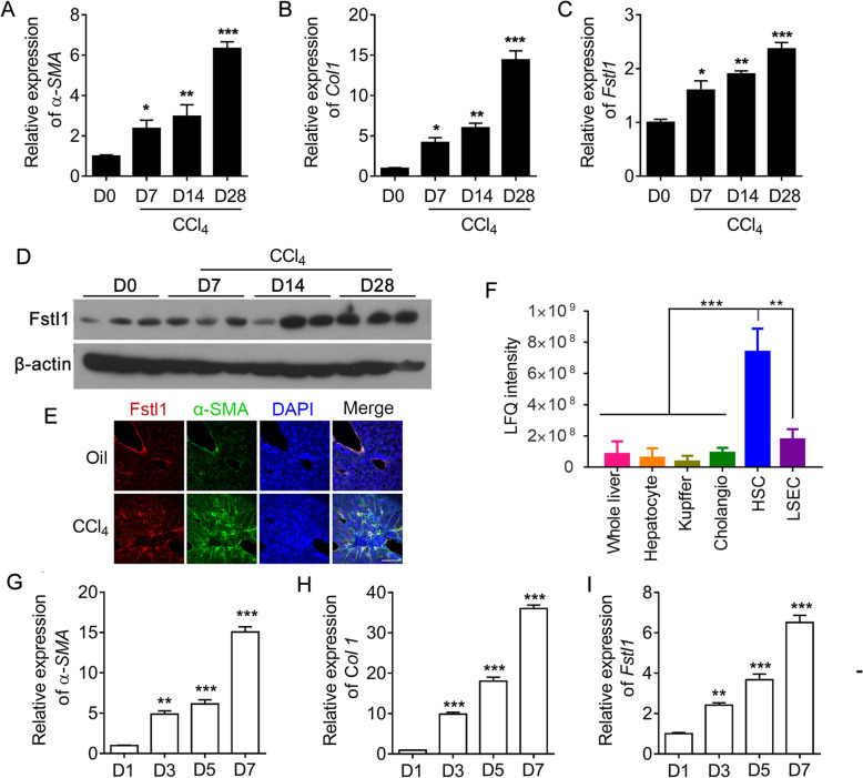 Fstl1 was associated with liver fibrosis and the activation of hepatic stellate cells. a-c qRT-PCR analysis of α-SMA, Col1, Fstl1 mRNA expression in liver tissues of C57BL/6 mice at the indicated time points after CCl4 treatment (n = 6 per group). d Western blot analysis of Fstl1 protein in liver tissues of C57BL/6 J mice at the indicated time points after CCl4 treatment (n = 3 per group). β-Actin was used as a loading control. e Frozen liver sections from oil or CCl4 treated mice were stained with Fstl1 (red), α-SMA (green) and DAPI (blue). Scale bar: 25 μm. f LFQ (label-free protein quantification) intensity of Fstl1 in murine liver, hepatocyte, kupffer, cholangio, HSC and LSEC (liver sinusoidal endothelial cells) (n = 4 per group). g-i qRT-PCR analysis of α-SMA, Col1, Fstl1 mRNA expression in primary isolated mouse HSCs in in vitro culture at the indicated time points (n = 5 per group). Throughout, data represent mean ± SEM.* P < 0.05, **P < 0.01, ***P < 0.001