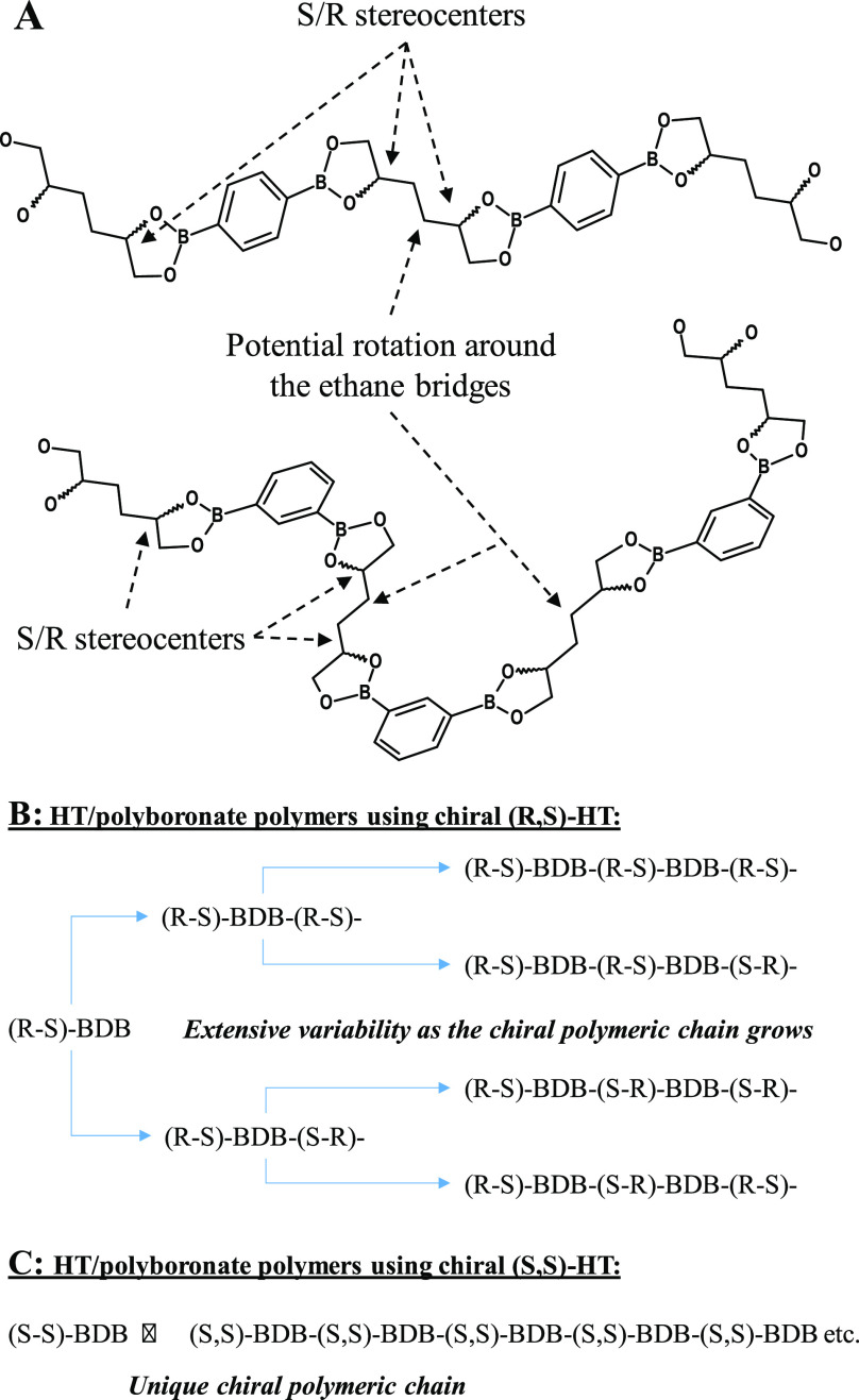 Scheme 1. (A) Schematic Visualization of Two Different HT (hexane-1,2,5,6-tetrol)-BDB (1,4- or 1,3-Benzenediboronic Acid) Polymeric Chains with Indication of the Stereocenters and Points of Potential Rotation of the Molecular Chains, (B) Illustrative Variability of the Growing Polymeric Chain When Incorporating Chirally Pure (R,S)-HT [Shown as (R-S)], and (C) Unique Chiral Polymer When Constructing the Polymeric Chain from (S,S)-HT [Shown as (S–S)].