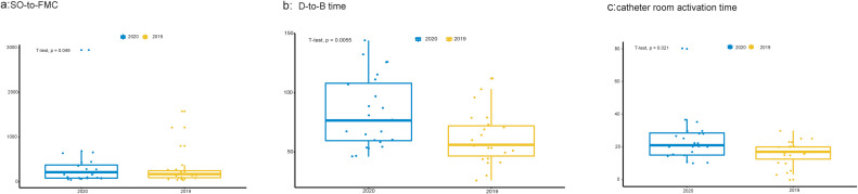 The average SO-to-FMC time was 319.4 ± 89.5 min in the 2020 group and 261.5 ± 87.3 min in the 2019 group (P = 0.049; Fig. 3a). The average D-to-B time in the 2020 and 2019 groups was 83.3 ± 29.7 and 61.1 ± 21.9 min, respectively (P = 0.006 Fig. 3b); The average catheter room activation time for patients in the 2020 group was 24.2 ± 14.1 min, and it was 16.1 ± 7.7 min in the 2019 group (P = 0.021; Fig. 3c). The results show that all three time measures were longer in 2020.