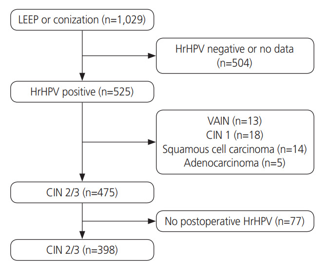 A flowchart of participant enrollment is provided in Fig. 1. A retrospective analysis was performed on 1,029 patients who underwent conization or LEEP at Korea University Guro Hospital and Anam Hospital between January 2014 and September 2018. We included patients for whom information on HPV genotypes before and after surgical treatment was available. Of these 1,029 patients, 504 were excluded because of preoperative negative hrHPV or lack of HPV data. The remaining 525 patients were documented to have hrHPV based on the AnyplexTM II (Seegene, Seoul, Korea) HPV genotyping test before operation. Patients with histologically confirmed CIN of grade 2/3 through punch biopsy were included. Of the remaining 525 patients, 31 and 19 were excluded due to diagnosis of VAIN or CIN-1, and due to invasive cervical cancer respectively. Finally, of the remaining 475 patients, 77 were lost to follow-up for HPV DNA testing after conization or LEEP, resulting in a total enrollment of 398 patients for this study.