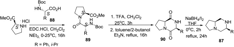 l-Proline methyl ester hydrochloride salt was coupled with N-Boc protected amino acid derivatives 88 to prepare dipeptides 89, which after TFA treatment and cyclization afforded diketopiperazine derivatives 90. Efficient (68–74% yields) reduction of the latter with the NaBH4/I2 reagent gave the desired enantiomerically pure bicyclic piperazines 87.49