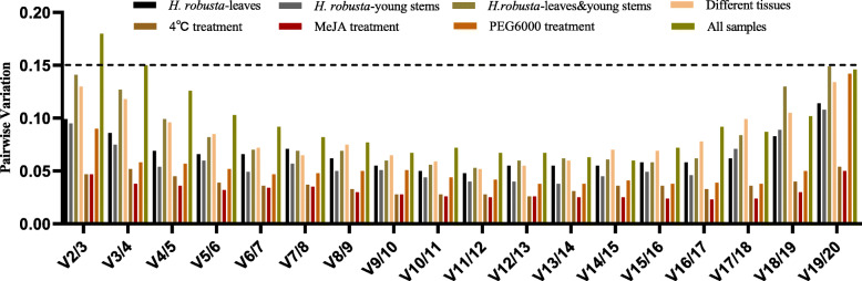 In general, it is more reliable to use multiple reference genes are more reliable than a single reference gene for quantitative gene analysis. Given this, geNorm calculates the pairwise variation (Vn/n + 1) of the normalization factor after the introduction of a new reference gene, and determines the optimal number of reference genes based on this ratio. The default Vn/n + 1 value for the software is 0.15. If the ratio is less than 0.15, the number of internal gene combinations that can meet the requirements for relative quantification is n, otherwise another reference gene needs to be introduced. In our study, the values of pairwise variation V2/3 under conditions with H. robusta treatment, 4 °C treatment, MeJA treatment, PEG6000 treatment, and different tissues, were all less than 0.15, indicating that the optimal number of reference gene combinations is two (Fig. 3). Across all samples, pairwise variation (V2/3) was 0.180, V3/4 was 0.15, and V4/5 was 0.126, indicating that the addition of the third and fourth reference genes has different impacts on the results. It always better to use fewer reference gene due to the time and cost economy consideration, hence the best reference gene combination was EF2, EF1, ACT7 and UBC5B for all the samples.