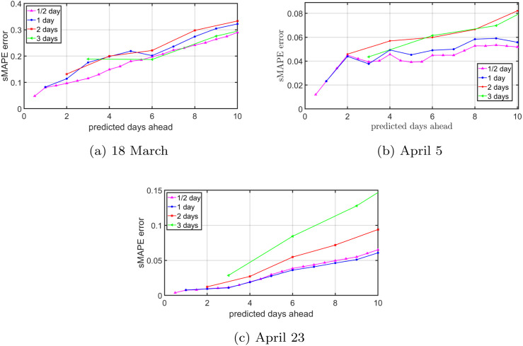 Fig. G.7, Fig. G.8 show an exemplary situation from the Netherlands for three initial dates. The configuration for the time steps day and days is equal in both figures. At the beginning of the COVID-19 outbreak, as shown in Fig. G.7(a) for method (A) and Fig. G.8(a) for method (B), the prediction accuracy is similar for all time steps. The small amount of available data and the rapidly increasing number of cases hampers accurate forecasting. As the epidemic evolves, method (A) and method (B) start to deviate. By omitting data, as in method (A), the sMAPE error in Fig. G.7 increases more quickly for time steps of two and three days than for smaller time steps. Hence, removing data causes the prediction accuracy to decrease. On the other hand, method (B) in Fig. G.8 shows similar behaviour for all time steps. We conclude that if the amount of data is unchanged, the choice of the time step has limited effect on the prediction accuracy.