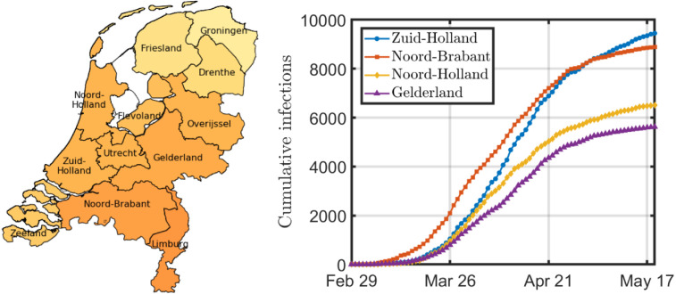 As a second case study, we regard the spread of COVID-19 in the Netherlands. The first patient, who had visited Italy the week before, was diagnosed on February 27. After February 27, the number of cases grew rapidly, as depicted in Fig. 4. The epidemic peak was observed at the end of March, and the daily number of cases subsequently dropped. We consider the spread of COVID-19 at a provincial level, for which data is available from the Dutch National Institute for Public Health and the Environment, called RIVM (RIVM, 2020). The Netherlands is subdivided into 12 provinces, for which the RIVM reports the daily number of new infections. Since the number of infected cases increased more gradually in the Netherlands than in Hubei, China, the total epidemic period is longer and more data points are available. A more gradual increase in the number of cases should be beneficial for the prediction accuracy.