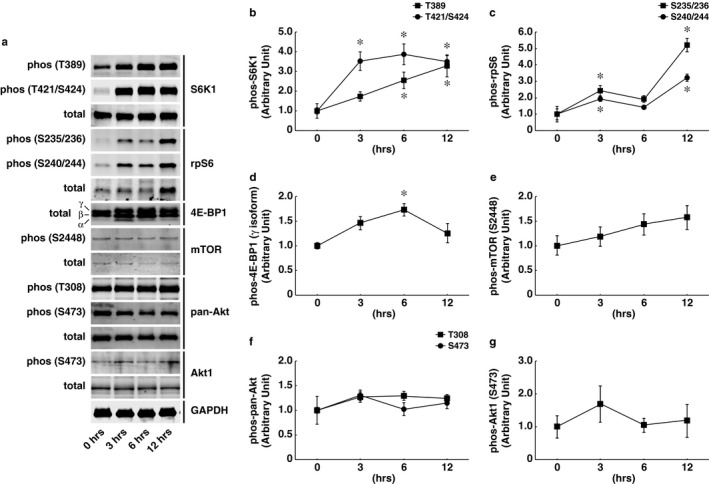 Temporal alteration of mechanistic target of rapamycin complex 1 (mTORC1) signaling in response to acute bout of mechanical overload. Mechanical overload‐induced phosphorylation of S6K1 (T389 and T421/S424 sites), rps6 (S235/236 and S240/244 sites), 4E‐BP1 (gamma isoform), mTOR (S2448 site), pan‐Akt (T308 and S473 sites), and Akt1 (S473) were determined in the plantaris muscle of male C57BL/6J mice. (a) Representative images showing phosphorylation status and total expression of each protein. GAPDH as an internal control. The relative (normalized to 0 hr) phosphorylation level of T389 and T421/S424 sites of S6K1 (b), S235/236 and S240/244 sites of rps6 (c), gamma isoform of 4E‐BP1 (d), S2448 site of mTOR (e), T308 and S473 sites of pan‐Akt (f), and S473 site of Akt1 (g) at each time point were quantified. n = 3/group. All results are expressed as mean ± SE. Significant differences: *compared to the control (0 hr) group, p < .05