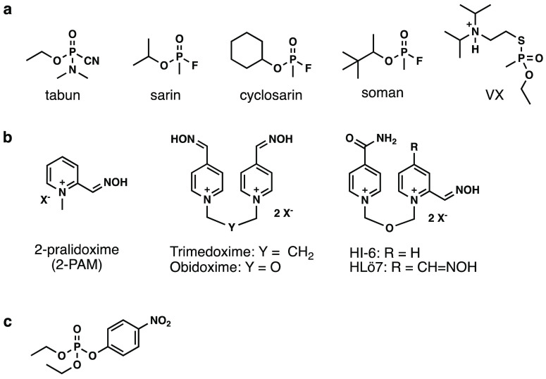 AChE inhibitors and clinically used antidotes: (a) Structures of organophosphorus nerve agents. (b) Structures of clinically used antidotes. (c) Structure of AChE inhibitor, paraoxon ethyl, used in this study.