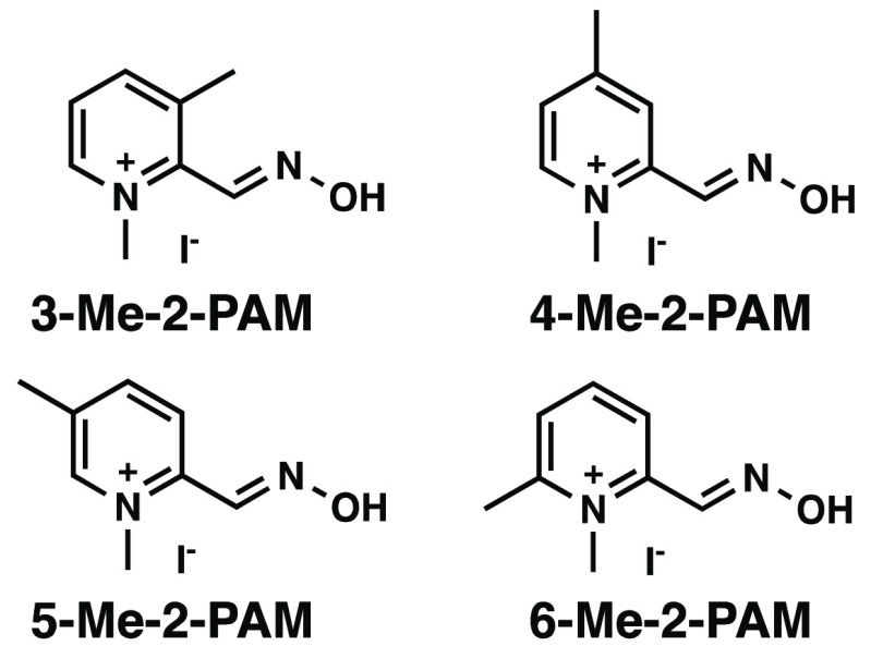 With respect to 2-pralidoxime (2-PAM) efficacy, the majority of previously conducted synthetic studies have focused either on developing bis-pyridinium oximes (via alteration of the N-alkyl group) or on modifying the electrostatic character of the core pyridinium.5−7 However, these modifications appear to have been driven by synthetic accessibility rather than establishing systematic and rational structure–activity relationships (SAR)8 and, therefore, fail to clearly delineate optimal substitution patterns for AChE active site complementarity. To our knowledge, no studies to date have systematically explored SAR for alkyl group substitution on the pyridinium ring of 2-PAM, i.e., with the position of the alkyl group being the only variable. Therefore, in the current work, we conducted a methyl scan on the pyridinium ring of 2-PAM to (1) systematically probe the steric and electrostatic constraints of the AChE binding site to provide a foundation for the rational, structure-based design of new analogs and (2) determine whether the active site can tolerate an additional alkyl group on the pyridinium ring. The results of this study would allow for the rational design of a new, more hydrophobic, and therefore more BBB permeable, therapeutic candidate than 2-PAM.11−13 We chose 2-PAM because this is the only antidote approved by the United States Food and Drug Administration and because the simpler structure provides a more tractable template than related dimeric compounds, such as HI-6. For example, if we installed a methyl group in HI-6, the biological results would be uninterpretable because the biological results would be a sum of two modifications. However, the results presented herein will, in future studies, be extended to further optimize dimeric analogs, since we will understand the impact of a single methylation substitution.