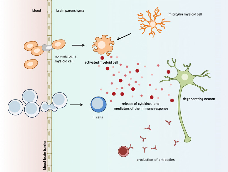 Neuroinflammation and considered immune-mediated mechanisms in Parkinson’s disease. Both innate (e.g. microglia and blood-born myeloid cells activation) and adaptive (e.g. T cells recruitment and antibodies production) immune responses could contribute to neuroinflammation