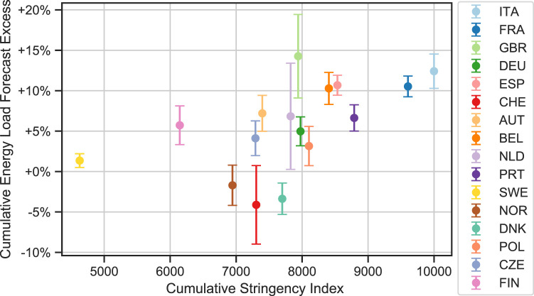 Cumulative Energy Stringency index versus Cumulative Forecast Excess for different nations. Standard deviation of the five previous years gives a representation of the yearly variability. The Spearman’s Correlation Coefficient is 0.73 with a -value of 0.001.