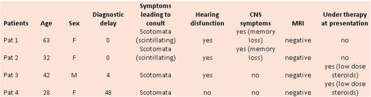 The constant ophthalmic presenting sign was a subjective scotoma that was scintillating in two cases. This was associated with hearing disturbances in 3 cases and cerebral signs such as memory loss in two cases. Two patients were under low dose systemic corticosteroid treatment, when seen in our centre.