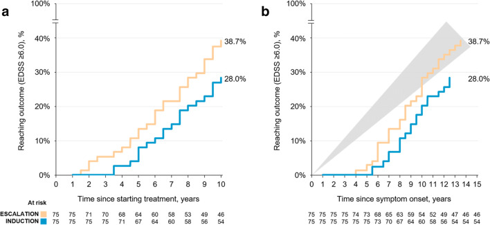 In our cohort, induction was associated with an approximately 50% reduced risk of reaching EDSS ≥ 6.0 as compared to escalation, albeit with a worse safety profile. Notably, the probability of reaching EDSS ≥ 6.0 in the escalation group overlaps, especially after 10 years from disease onset, with the estimated median disease duration since symptom onset to EDSS score ≥ 6.0 reported in natural history studies, ranging from 14 to 20 years (see also Fig. 3B) [27]. The analysis of baseline variables associated with worse outcome also confirms that (1) the longer the time to treatment start, the worse the long-term outcomes when starting with escalation [18], and (2) younger age is associated with better outcome after induction [21].