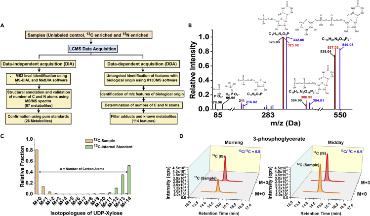 (A–D) (A) Overall methodology: Tandem mass spectrometry (MS2) data were acquired in data-dependent (DDA) and data-independent SWATH modes and the latter used for metabolite identification (see Transparent Methods and Tables S2–S4, and S5 for further details). The carbon and nitrogen composition of the metabolites and their fragments was confirmed from the mass shifts observed in the 13C- or 15N-labeled metabolite extracts. X13CMS software was used to detect isotopic enrichment in an untargeted manner. (B) MS2 spectra of UDP-xylose in negative ion mode, a representative metabolite identified by MS-DIAL. The black, blue, and red bars represent the mass spectra of the monoisotopic peaks from the control, 13C-, and 15N-enriched samples, respectively. (C) The mass isotopologue distribution (MID) of the control and 13C-enriched samples as obtained from X13CMS, exemplified with UDP-xylose. (D) Quantification of relative metabolite levels using isotopic area ratio method (12C/13C) exemplified for 3-phosphoglyceric acid (3PGA) in two conditions. An equal amount of 13C-enriched metabolite extract of S. elongatus PCC 11801 was added in all samples, thus affording a retention time-matched and mass-shifted internal standard for each metabolite.
