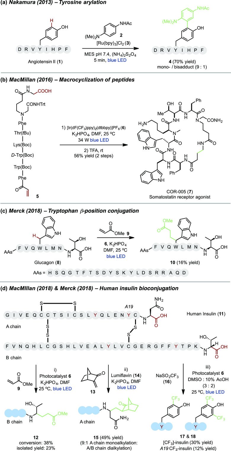 Recently, MacMillan and co-workers reported a method for the decarboxylative macrocyclization of peptides containing N-terminal Michael acceptors via photocatalytic intramolecular radical 1,4-addition. COR-005 (7), a somatostatin analogue, was successfully synthesized in 56% yield by this photoredox-mediated cyclization of linear peptide 5 using [Ir(dF(CF3)ppy)2(dtbbpy)]PF6 (6) as the photocatalyst followed by acidic deprotection (Figure 3b).34