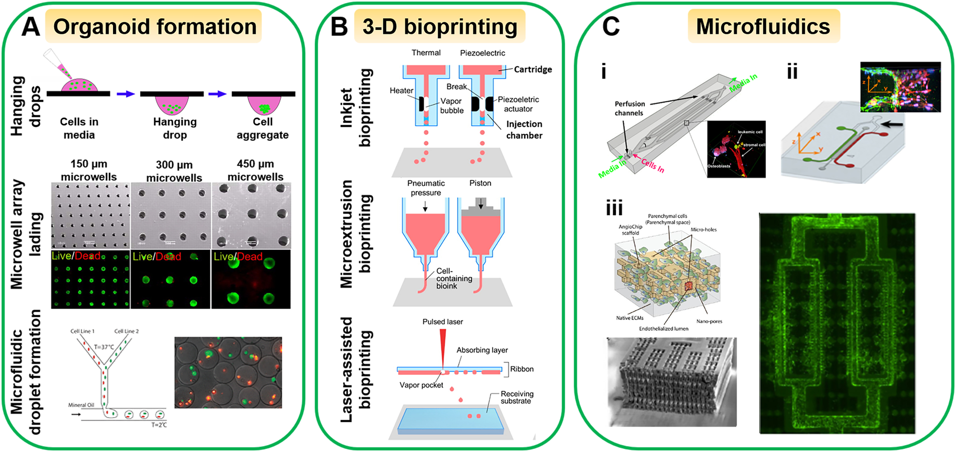 3-D bioprinting is an additive manufacturing approach to create tissue constructs by using 3-D printers and bio-inks (biomaterials and/or living cells). Applying 3-D bioprinting to build microphysiological systems is promising because this technique is capable of recreating the cellular architecture similar to human tissues/organs by precisely coordinating multiple types of cells in the construct.42, 115–118 Based on the working principle, 3-D bioprinting methods can be categorized into three types: inkjet bioprinting, microextrusion bioprinting and laser-assisted bioprinting (Figure 3B).