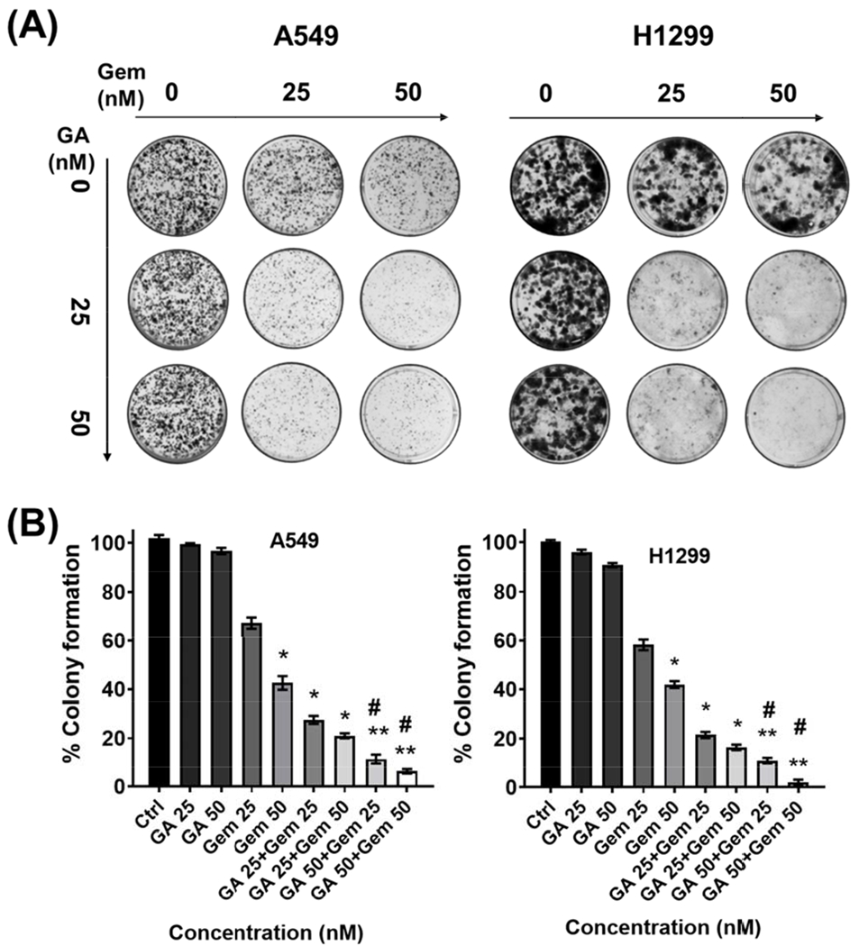 (A) Colony formation capability of NSCLC cells were analyzed for the above-mentioned individual GA and Gem concentration, and their combination for 15 days. (B) Graphical representation of quantitative data analyzed with ImageJ; untreated cells were taken as control (100%). Values represent the mean ± S.E.M. (n=3). The significance level was *P < 0.05 and **P < 0.01 compared to controls cells, and #P < 0.05 compared to their individual drugs.