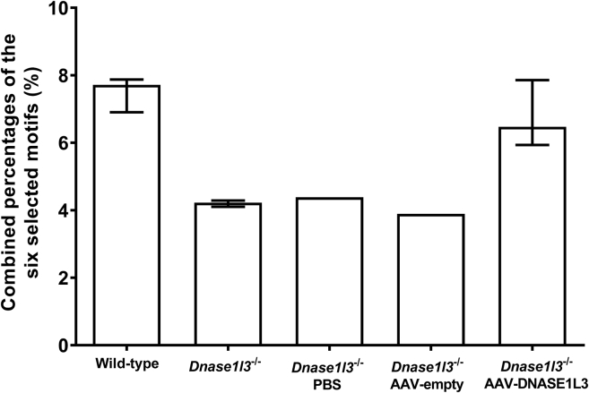 Figure 9 shows the frequency of the combined percentages of the top six motifs in the plasma DNA of these mice. After Dnase1l3 transduction, the combined percentage in Dnase1l3-deficient mice was increased and comparable to that of the reference wild-type mice. However, Dnase1l3-deficient mice injected with PBS or empty AAV particles did not show any increase in the combined percentage of the top six motifs. Frequencies for each of the top six motifs (Figures S5A–S5F) were consistent with the combined percentages shown in Figure 9. In addition to supporting the contribution of DNASE1L3 to the fragmentation of plasma DNA at the systemic level, these data suggest that Dnase1l3 transduction via AAV8 transfection could restore the DNA size and motif frequencies of plasma DNA in Dnase1l3-deficient mice to the wild-type state.