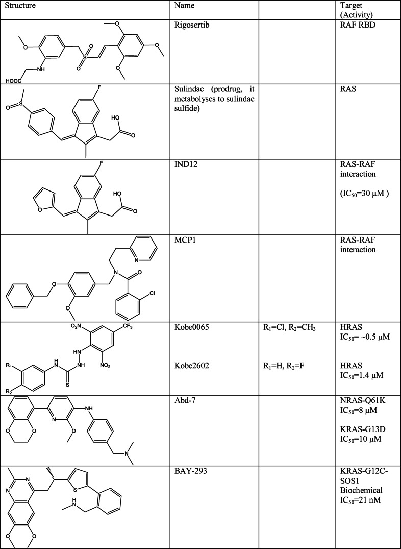 Other set of compounds (as MCP1 (Table 3)) was reported by Kato-Stankiewicz and co-workers, which was identified to inhibit RAS-RAF interaction in HT1080 (NRAS-Q61K), in PANC-1 (KRAS-G12D) and in A549 (G12S) cells in 10–20 μM range; however, these compounds also influenced ERK phosphorylation [81]. The authors also could not clearly prove direct RAS or RAF binding as in the case of sulindac derivatives.