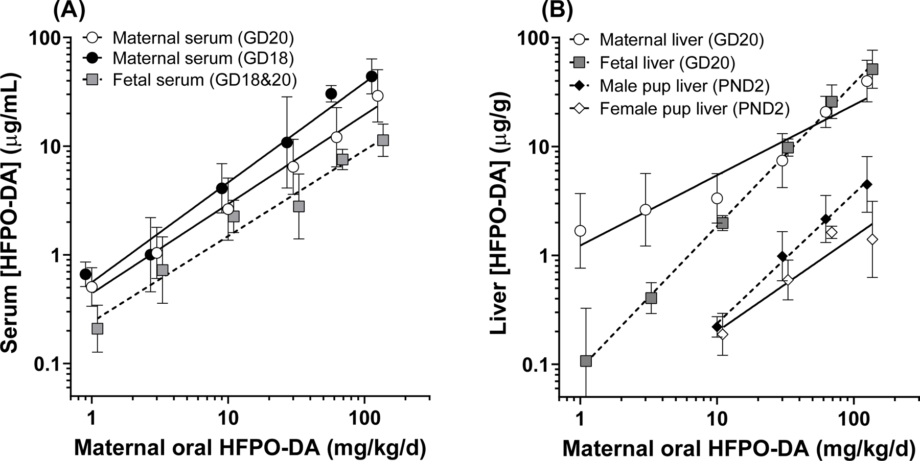 Maternal serum and liver HFPO-DA concentrations increased as a function of oral dose during both the GD16–20 and GD8-PND2 dosing intervals (Figure 4C,D; Supplemental Table 11). There was no difference in serum or liver HFPO-DA concentration within a given dose group between the two dosing intervals indicating that longer exposure did not lead to bioaccumulation.