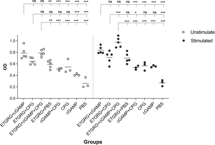 Regard to stimulation status, our findings showed that only in immunized mice with E7GRG + 2′-3′cGAMP + CpG-C a significant difference was found before and after stimulation (p < 0.001), and no difference was found for other groups.