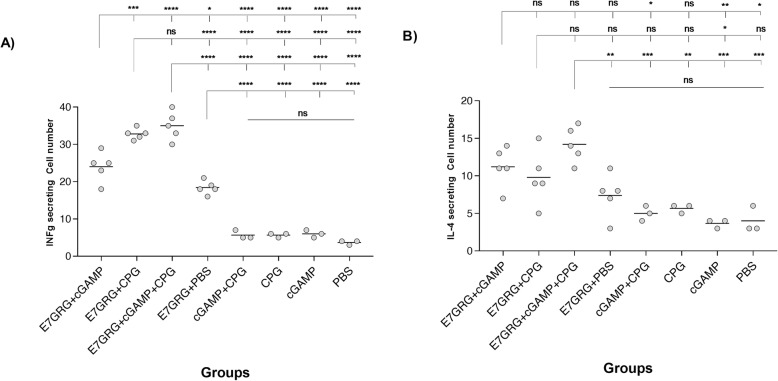 Analysis of IL-4 levels revealed that there was a statistically significant difference between E7GRG + 2′-3′cGAMP + CpG-C and control groups (E7GRG + PBS, 2′-3′cGAMP, CpG-C, 2′-3′cGAMP + CpG-C, and PBS). As indicated in Fig. 2, no statistically significant difference was observed among control groups.