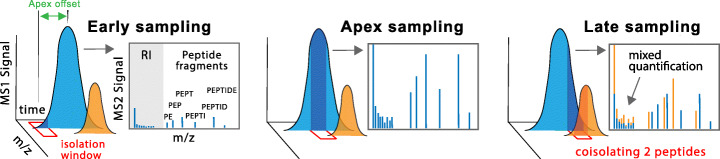 The sensitivity and quantification of LC-MS/MS experiments depend on numerous instrument parameters whose tuning often depends on trial-and-error approaches [25]. For example, tuned parameters may increase the number of chromatographic peaks sampled at their apexes, thus increasing the copies of peptide ions used for quantification, see Fig. 2. To make such optimizations more systematic, SCoPE2 employs DO-MS to interactively display data required for the rational optimization of instrument parameters and performance.