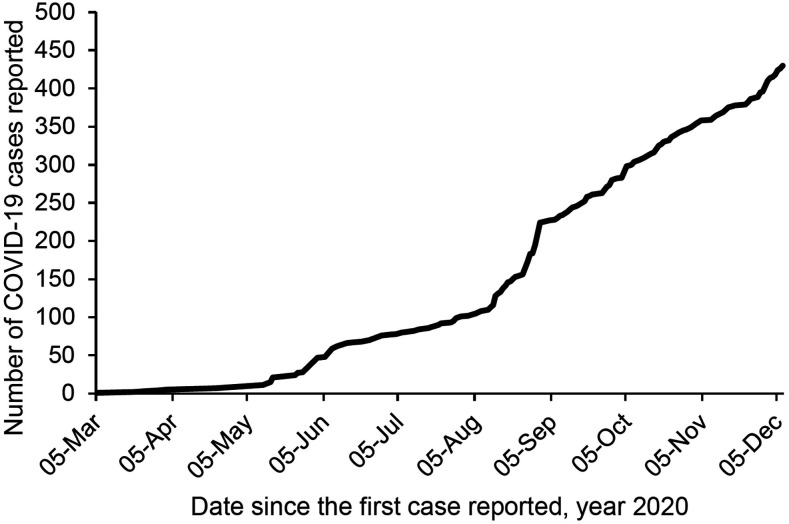The number of COVID-19 cases in Bhutan from March to December 7, 2020 reported by the Ministry of Health, Royal Government of Bhutan.